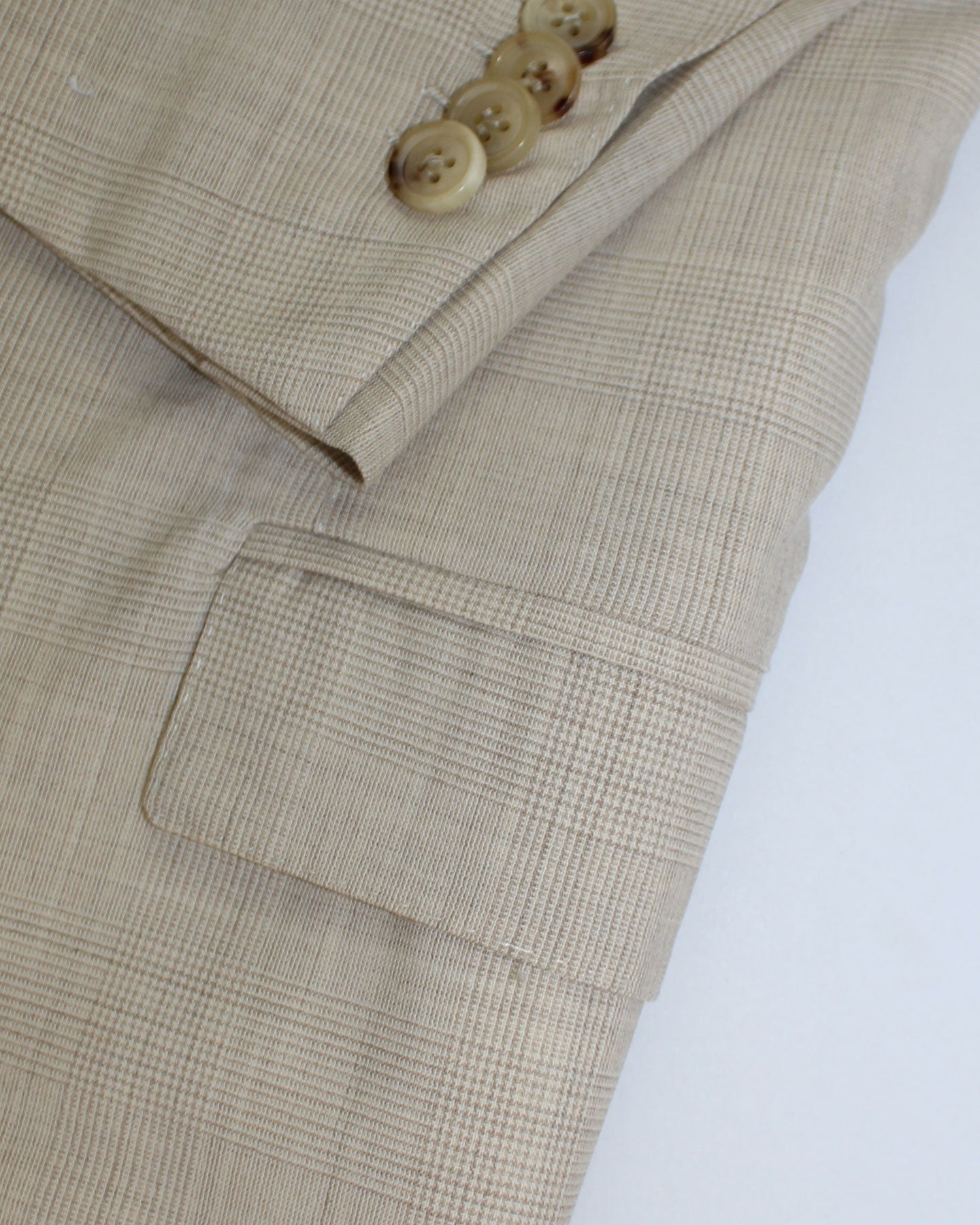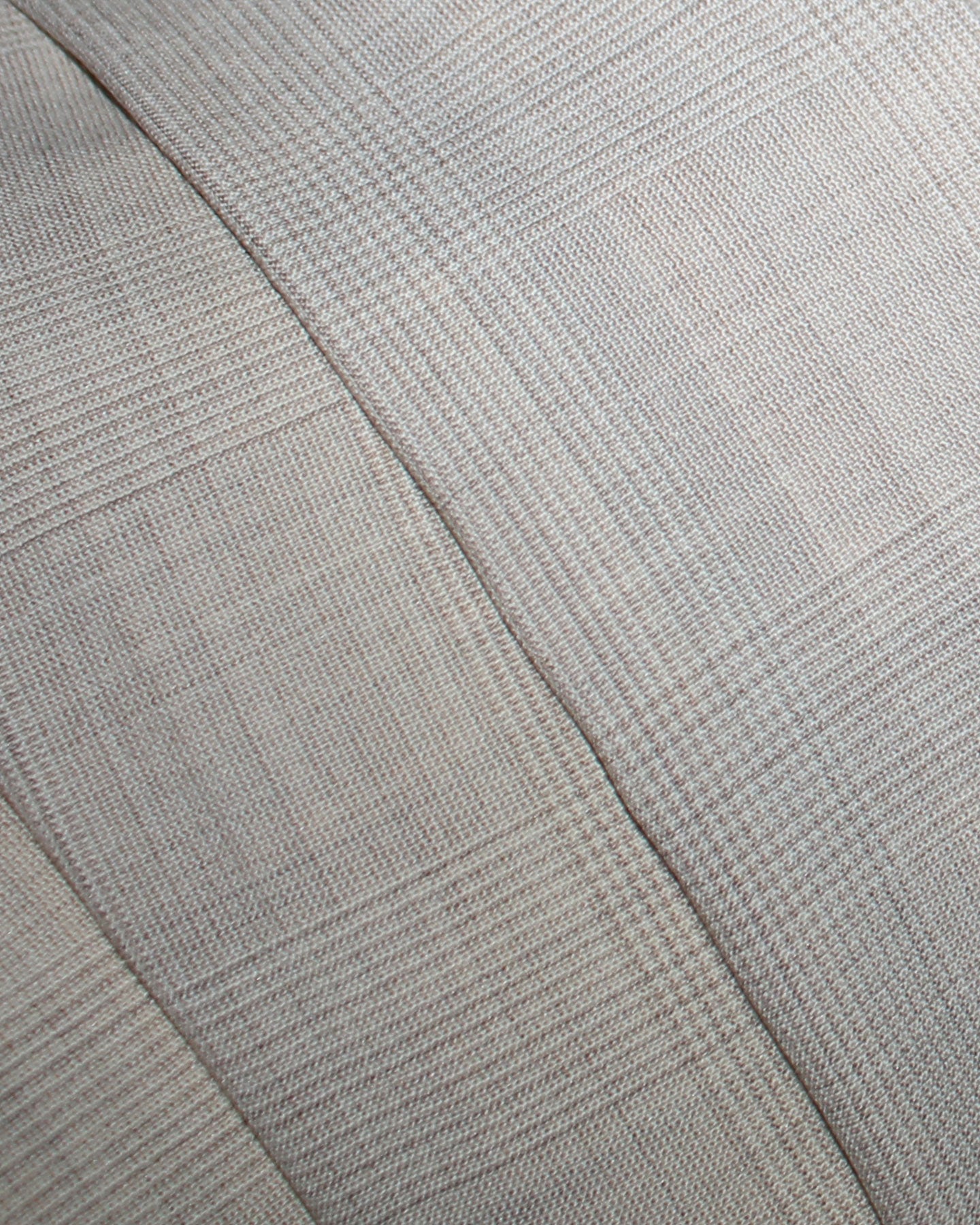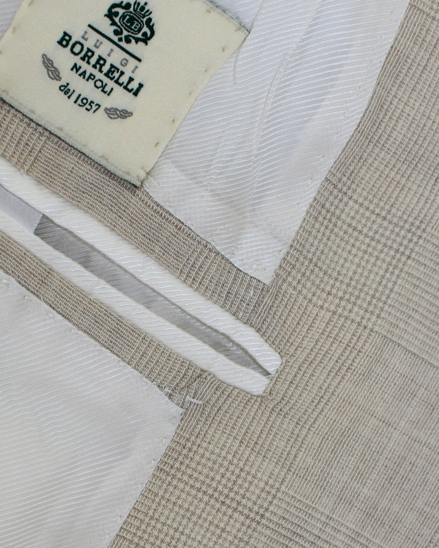 Genuine Luigi Borrelli suit, beige subtle plaid design, 3 button jacket, wool/ silk, unlined, flap pockets, notch lapel, flat front pants, sartorial, hand made in Italy. Sartorial quality men sport jackets and suits by Luigi Borrelli. Shop Bespoke Sport Coats.