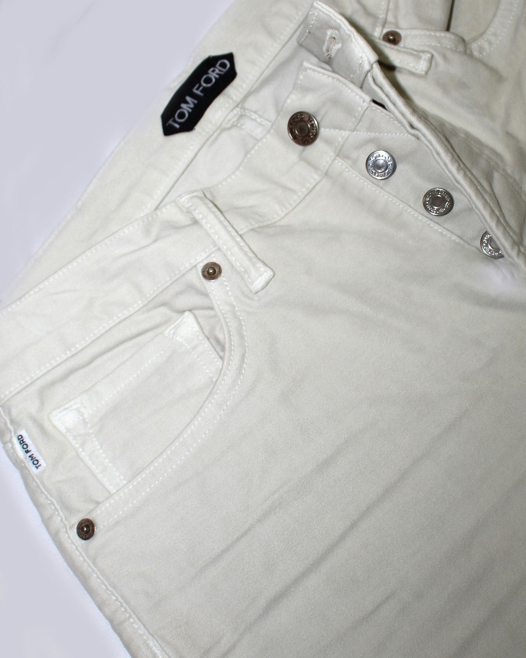 Genuine Tom Ford pants, slim fit, 5 pocket, tan, button fly, cotton, made in USA. Top quality men denim jeans/ 5 pocket pants. Shop all luxury designer pants/ jeans.