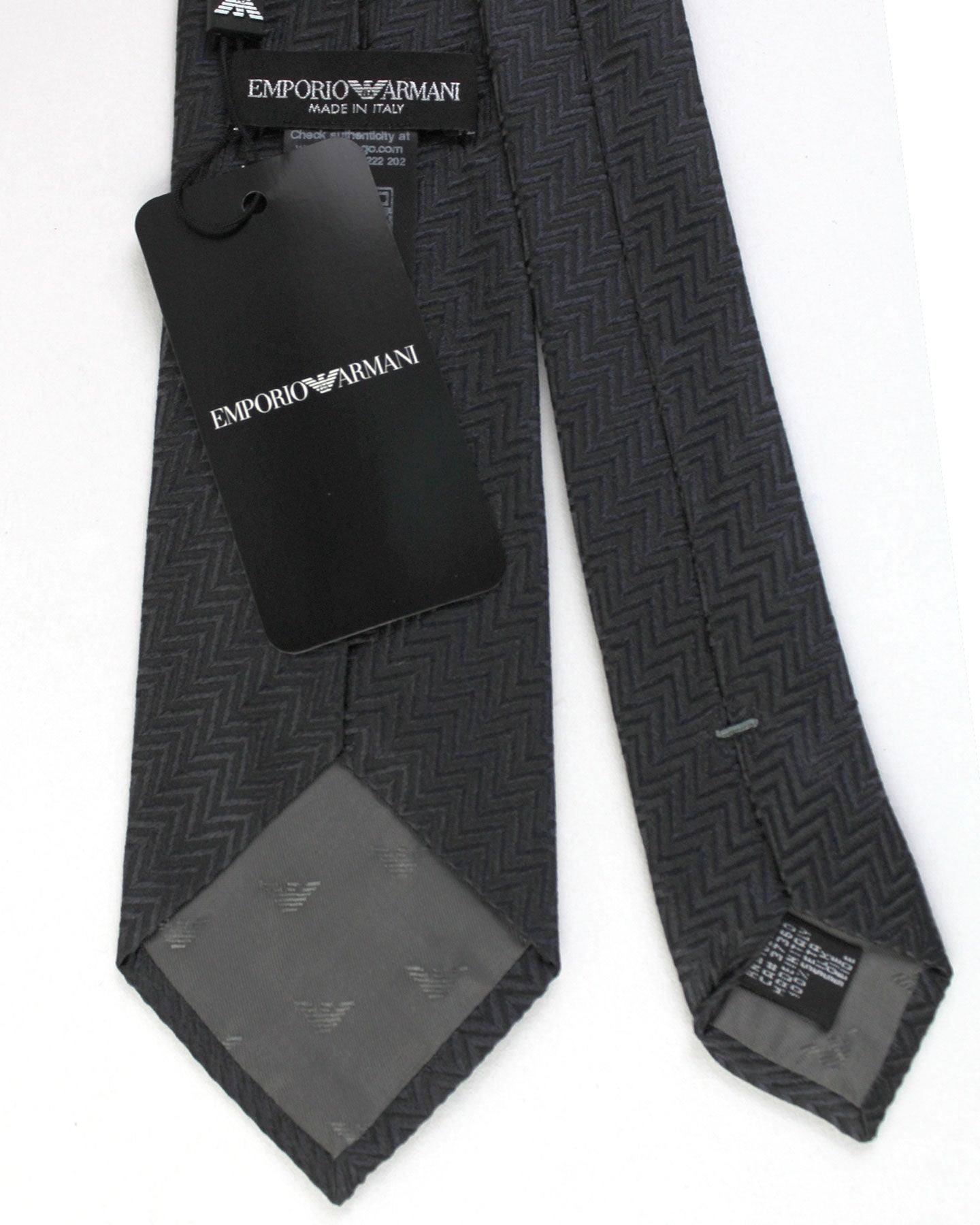 Genuine Emporio Armani tie, silk, black gray herringbone design, hand made in Italy. Luxury Armani men collection online. Discount men designer ties.