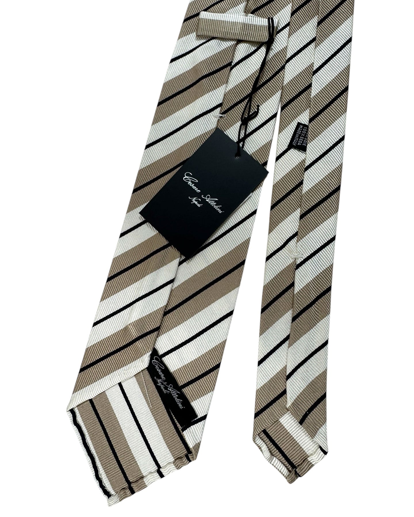 - SALE - Genuine Cesare Attolini Napoli unlined tie, taupe white stripes design, jacquard silk, hand made in Italy. Cesare Attolini is a sartorial / bespoke brand from Napoli, Italy.