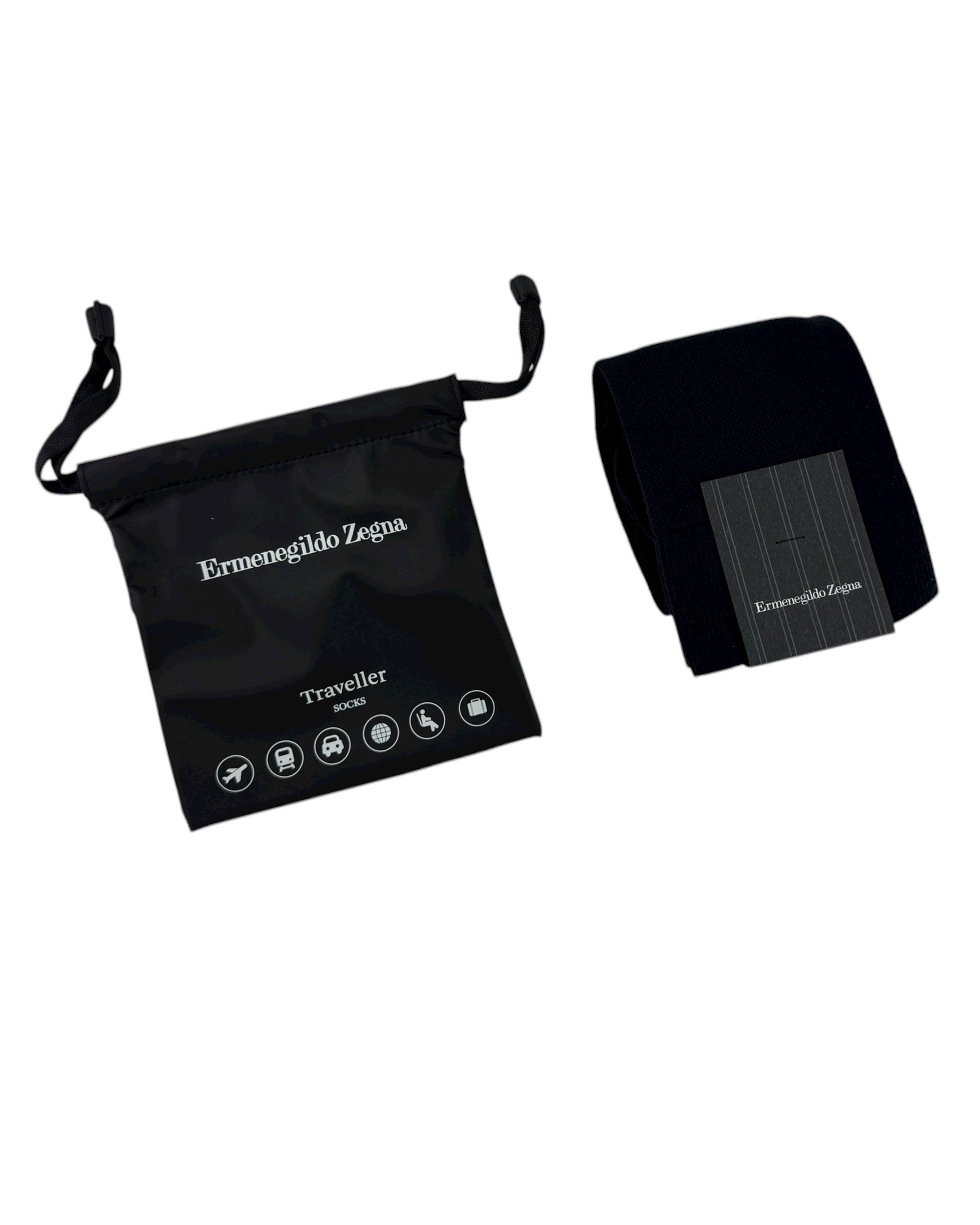 Great gift for the business traveller! Genuine Ermenegildo Zegna socks, dark blue, luxury medium weight stretch cotton, small EZ logo in a modest gray, over the calf - knee height, original Zegna gift / traveler bag, made in Italy. Authentic Ermenegildo Zegna, men socks and fashion accessories, outlet prices.